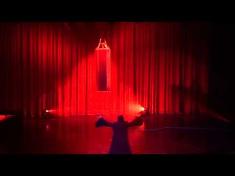 Assistant enters a large metallic container. Swords are inserted. Container is raised above the stage, the doors drop open, and the assistant has vanished into thin air!